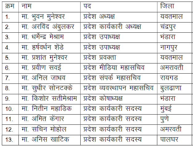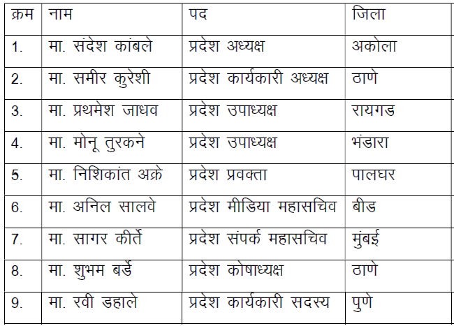 भारतीय बेरोजगार मोर्चा प्रदेश कार्यनिष्पादन समिती, महाराष्ट्र राज्य